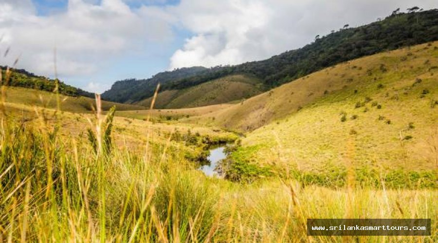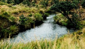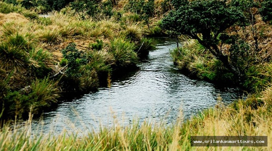 Waterlogged swamps or slow moving streams are found in low-lying areas, and macrophytes such as Aponogeton jacobsenii, sedge species Isolopis fluitans and Utricularia spp. are found near the slow moving streams. The bamboo Chimonobambusa densifolia thrive along the banks of the streams, and near the swampy areas grass species such as Juncus prismatocarpus, Garnotia mutica, Eriocaulon spp. and Exacum trinervium are common. Tussock grasses such as Chrysopogon zeylanicus and Cymbopogon confertiflorus are found in the wet hollows.