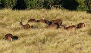 The vertebrate fauna of the region includes 24 species of mammals, 87 species of birds, nine species of reptiles and eight species of amphibians. The Sri Lankan elephant disappeared from the region in the 1940s at the latest. At present, the largest and the most commonly seen mammal is the sambar deer. Some research findings estimate the population of sambar deer to be around 1500 to 2000, possibly more than the carrying capacity of the plains. Other mammal species found in the park include Kelaart's long-clawed shrews, toque macaques, purple-faced langurs, rusty-spotted cat, Sri Lankan leopards, wild boars, stripe-necked mongooses, Sri Lankan spotted chevrotains, Indian muntjacs, and grizzled giant squirrels. Fishing cats and European otters visit the wetlands of the park to prey on aquatic animals. A subspecies of red slender loris, the Horton Plains slender loris (Loris tardigradus nycticeboides formerly sometimes considered as Loris lydekkerianus nycticeboides) is found only in highlands of Sri Lanka and is considered one of the world's most endangered primates. In July 2010 a group of researchers from the Zoological Society of London was able to photograph the mammal for the first time.
